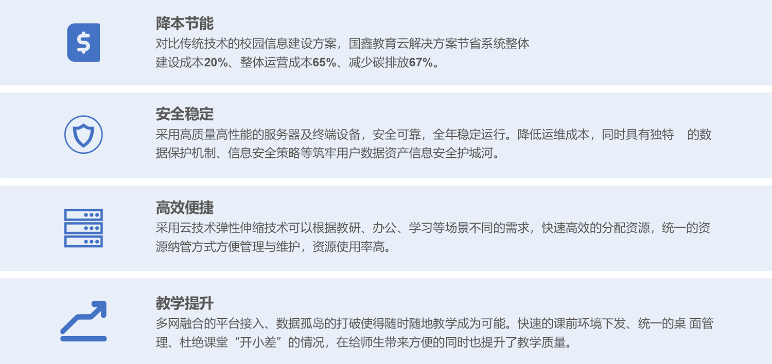 应用层平台支持多种办公应用软件、并与国产化操作系统、国产化中间件、国产化数据库等进行适配,可以用于信创场景部署。同时给予多种教学软件的支持功能,并开放第三方接口用于适配校本化教学软件,满足各类学校的教学业务需求。